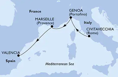 Маршрут: Чивитавекия, Рим (Италия)/ Генуа, (Портофино), Италия / Марсилия, Франция/ Валенсия, Испания