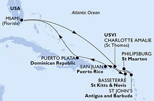 Маршрут: Маями, САЩ / Шарлот Амали (о-в Сен Томас), Американски Вирджински острови / Бастер, Сейнт Китс и Невис / Филипсбург, Сен Мартен / Сейнт Джонс, Антигуа и Барбуда / Сан Хуан, Пуерто Рико / Пуерто Плата, Доминиканска република / Маями, САЩ