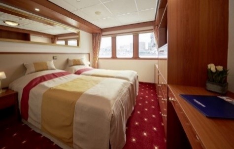 Кабините са с големина 14 кв.м. и са разположени на две палуби, а интериорът ще ви накара да се потопите в истински лукс. Кабините на долна палуба са с големи прозорци над нивото на водата, а тези на горна палуба са с френски прозорци. Всяка каюта разполага с телевизор, телефон, сейф, климатик с индивидуално регулиране, сешоар, баня с душ кабина, тоалетна.